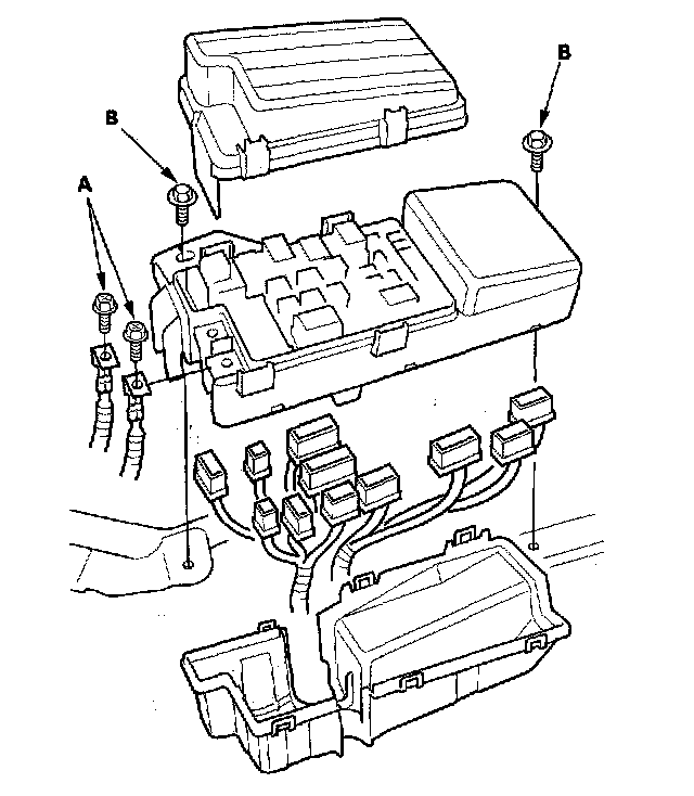 5. Remove the two mounting bolts (B) from the under-hood fuse/relay box.