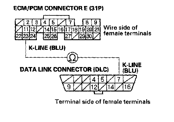 NO - Repair open in the wire between DLC terminal No. 7 and the ECM/PCM (E23). After repairing the wire, check for a DTC with the HDS, then go to the indicated DTC's troubleshooting.