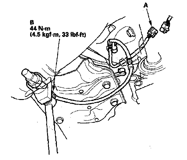 1. Disconnect the A/F sensor 4P connector (A), then remove the A/F sensor (B).