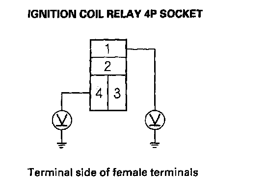 3. Measure the voltage between ignition coil relay 4P socket terminal No. 1 and body ground, then terminal No. 4 and body ground.