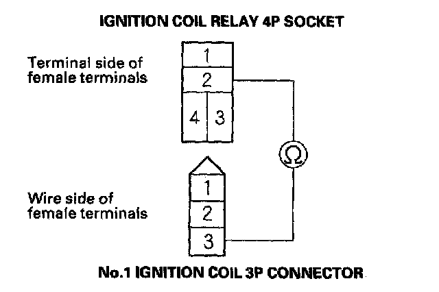 4. Check for continuity between ignition coil relay 4P socket terminal No. 2 and the No. 1 ignition coil 3P connector terminal No. 3.