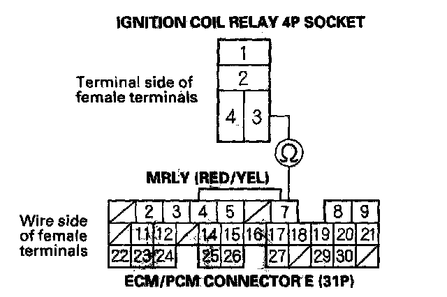 NO - Repair an open in the wire between ignition coil relay 4P socket terminal No. 3 and the ECM/PCM (E7).
