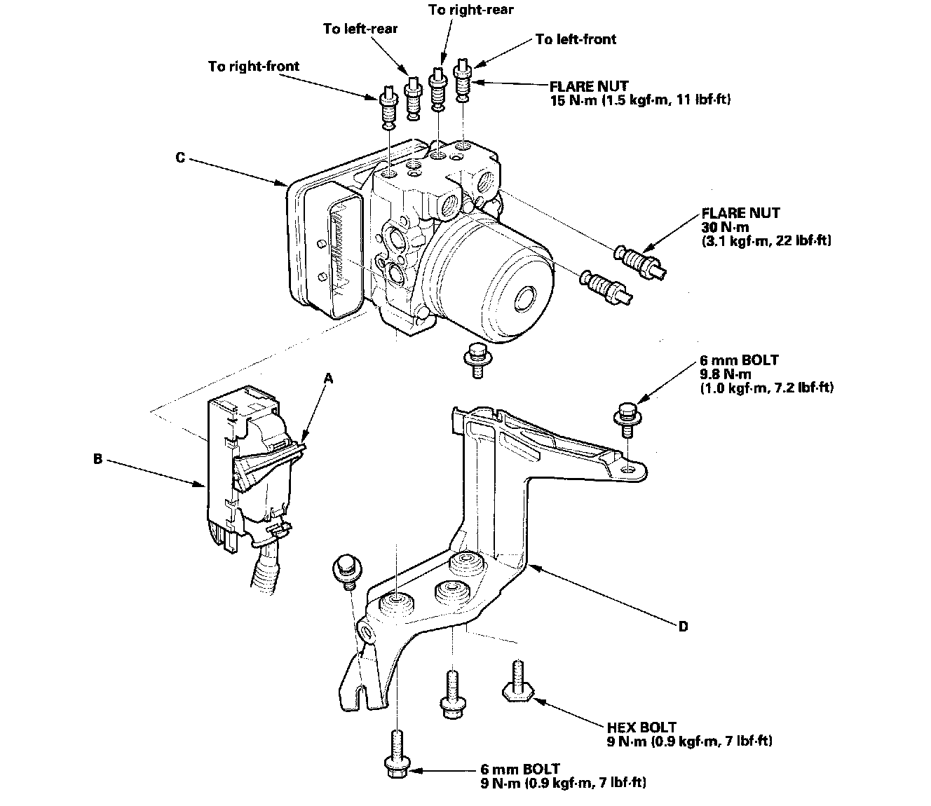 3. Remove the three 6 mm bolts, then remove the VSA modulator-control unit (C)/bracket (D) from the body.