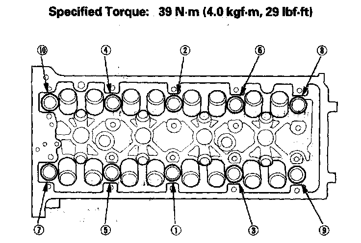 Tighten the cylinder head bolts in sequence to 39 Nm (4.0 kgf-m, 29 ft. lbs.). Use a beam-type torque wrench. When using a preset-type torque wrench, be sure to tighten slowly and do not overtighten. If a bolt makes any noise while you are torquing it, loosen the bolt and retighten it from the first step.