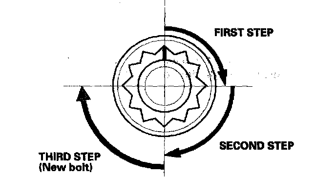 After torquing, tighten all cylinder head bolts in two steps (90° per step). If you are using a new cylinder head bolt, tighten the bolt an extra 90°.