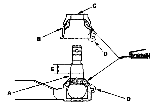 ^ Keep grease off the boot mounting area (D) and the tapered section (E) of the ball pin.