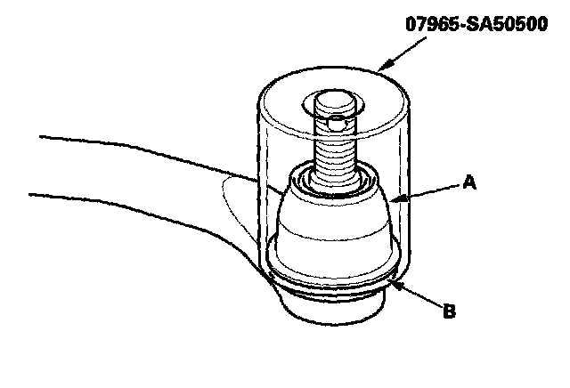 4. Install the new boot (A) using the special tool. The boot must not have a gap at the boot installation sections (B). After installing the boot, check the ball pin tapered section for grease contamination, and wipe it if necessary.