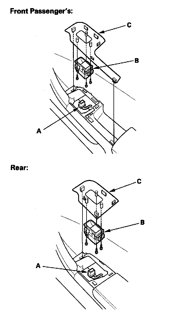 2. Disconnect the power window switch connector (A), then remove the three mounting screws and the power window switch (B) from the switch trim (C).