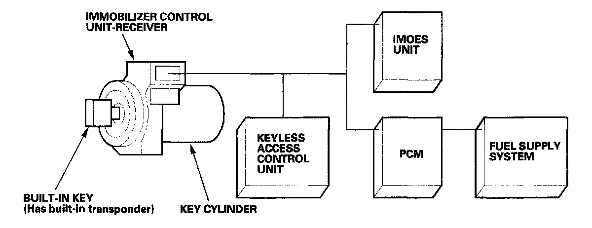 When the built-in key is inserted in the ignition switch and turned to the ON (II) position, the immobilizer control unit-receiver sends power to the transponder in the built-in key. The transponder then sends a coded signal back to the immobilizer control unit-receiver which then sends a coded signal to the PCM and the IMOES unit. The PCM and the IMOES unit identify this coded signal, then fuel pump power is supplied.