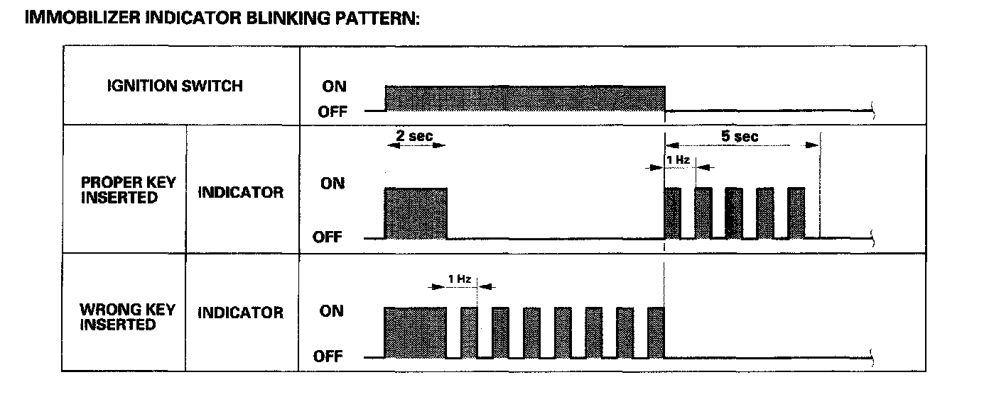 - If the proper key or remote has been used, the immobilizer indicator will come on for about 2 seconds, then go off. When the ignition switch is turned OFF, the indicator will blink for about 5 seconds to signal that the unit has reset correctly, then the indicator will go off.