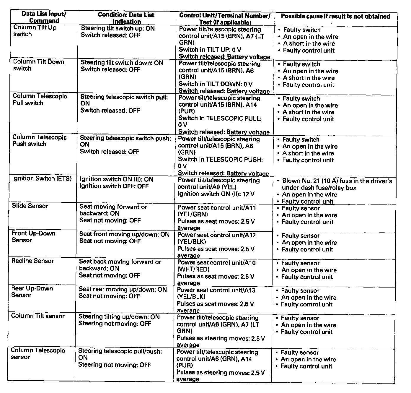 - If the function does not occur, do the appropriate test at the control unit and terminal indicated in the table.