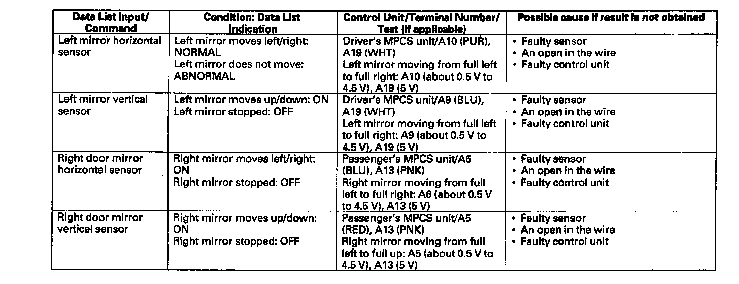 - If the data list indication is not correct, perform the appropriate test at the control unit and terminal indicated in the table.