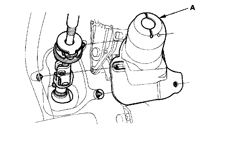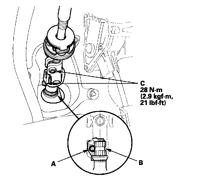 5. Align the bolt hole (A) on the steering joint with the groove (B) around the pinion shaft, and loosely install the joint bolts (C). Be sure that the joint bolt is securely in the groove in the pinion shaft. Pull on the steering joint to make sure that the steering joint is fully seated. Tighten the steering joint bolt to the specified torque.