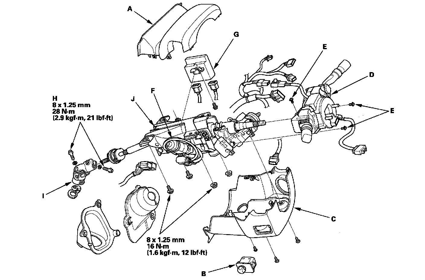 13. Remove the steering column (J) by removing the attaching nuts and bolts.