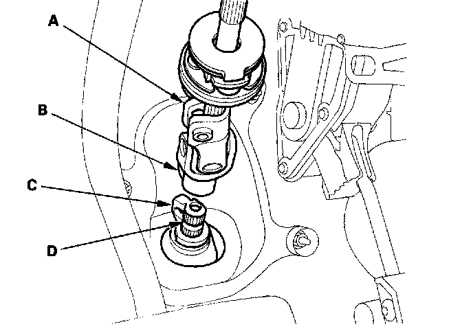 4. With the rack in the straight ahead driving position, slip the lower end of the steering joint on to the pinion shaft (D).