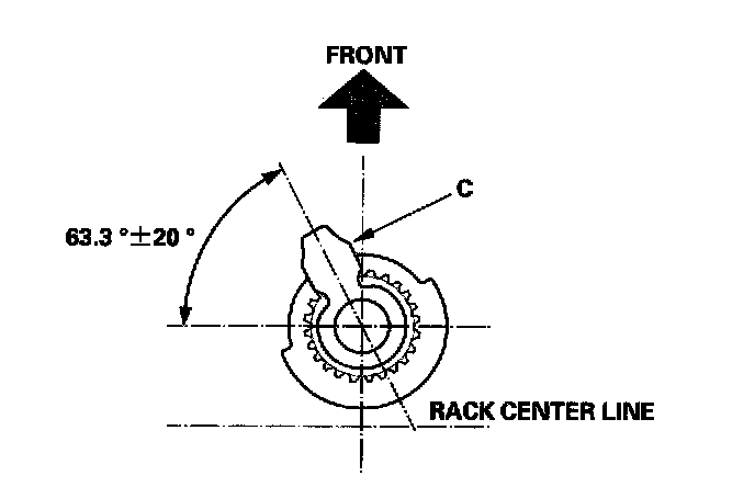 3. Install the steering joint (A) aligning the slit (B) of the steering joint with the tab (C) of the center guide. Position the angle of the center guide as shown if necessary.