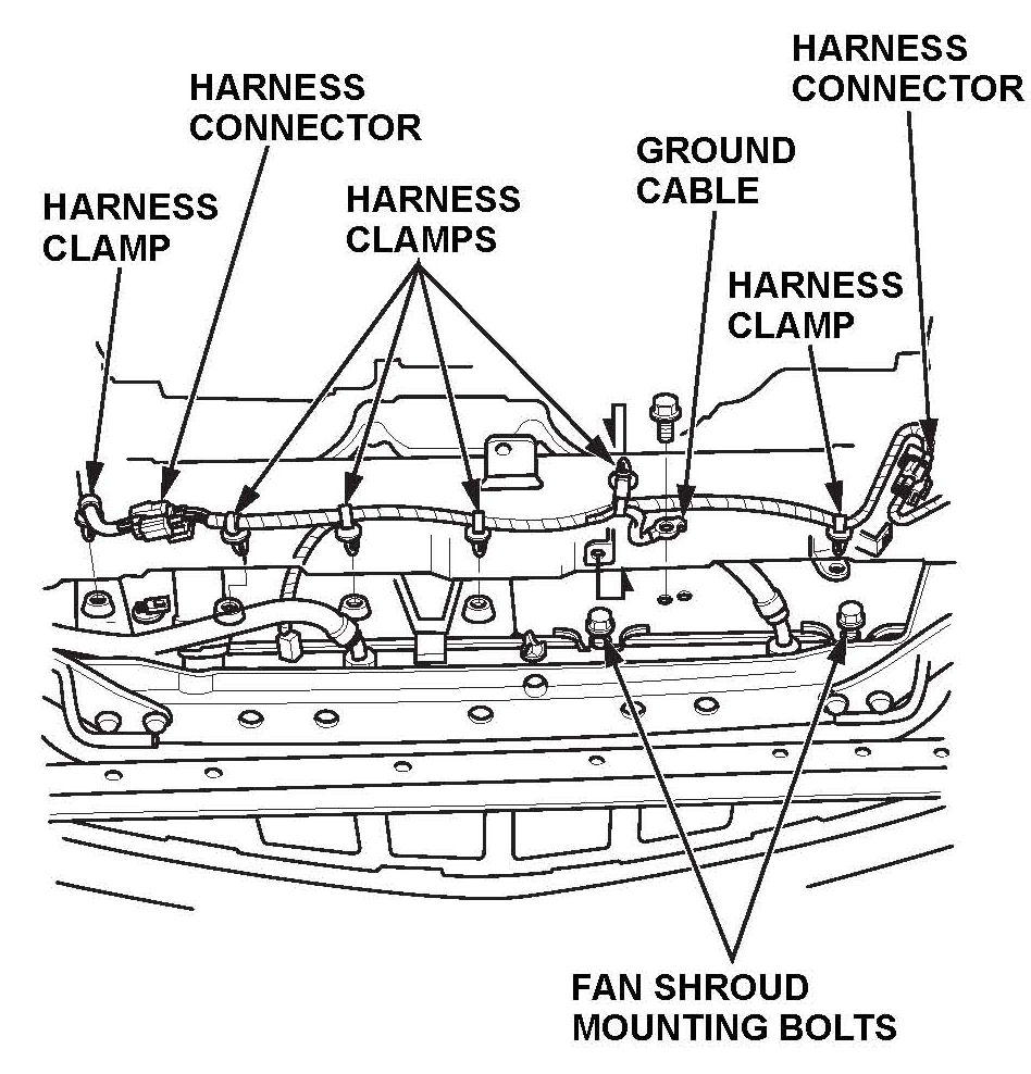 25. Reconnect the RFC connectors and the A/C condenser fan motor connector, then install the clamps.