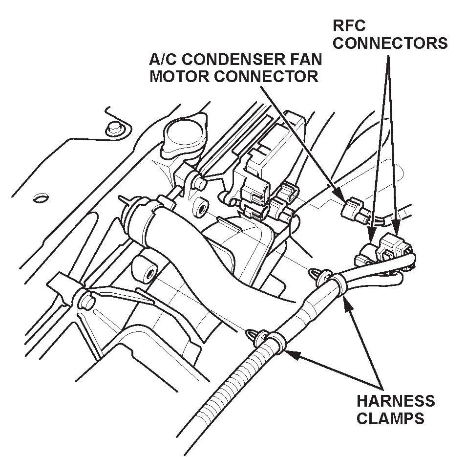 8. Disconnect the RFC connectors and the A/C condenser fan motor connector, then remove the harness clamps.