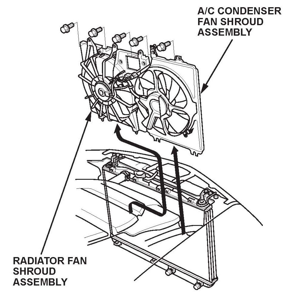 Pull up the radiator, then move the radiator fan shroud assembly toward the right side of the vehicle to allow enough space to lift it up and away from the A/C condenser fan shroud assembly.