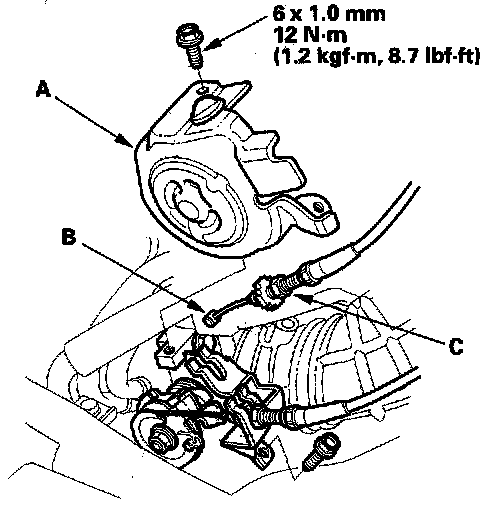 Cruise Control Actuator/Cable Replacement1. K20A3 engine: Remove the throttle cover (A), fully open the cruise control link by hand, then remove the cruise control cable (B) from link. Loosen the locknut (C), and remove the cable from the bracket.