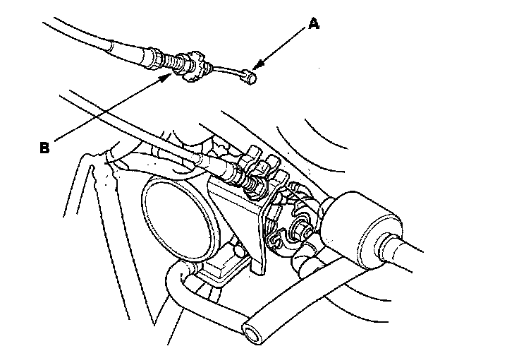 2. K20A2, K20Z1 engines: Fully open the cruise control link by hand, then remove the cruise control cable (A) from the link. Loosen the locknut (B), and remove the cable from the bracket.