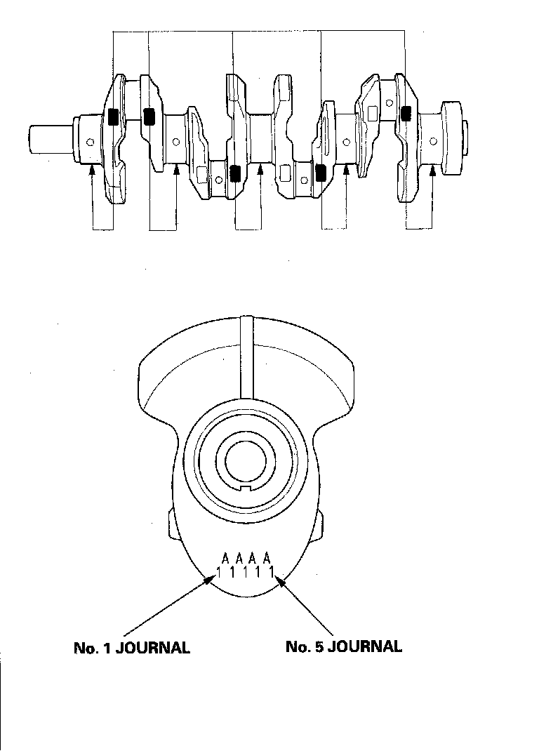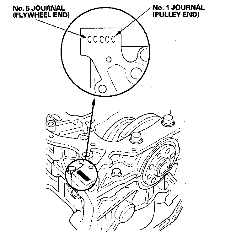 1. Numbers or letters or bars have been stamped on the end of the block as a code for the size of each of the five main journal bores. Write down the crank bore codes. If you can't read the codes because of accumulated dirt and dust, do not scrub them with a wire brush or scraper. Clean them only with solvent or detergent.