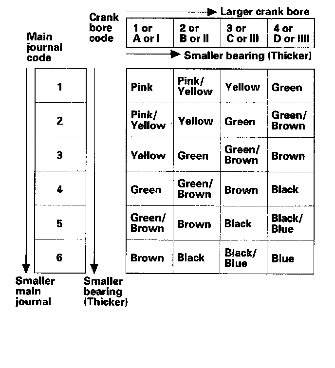 3. Use the crank bore codes and crank journal codes to select the appropriate replacement bearings from the table.