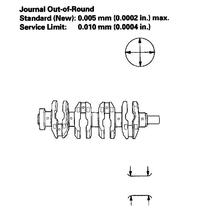 4. Measure out-of-round at the middle of each rod and main journal in two, places. The difference between measurements on each journal must not be more than the service limit.