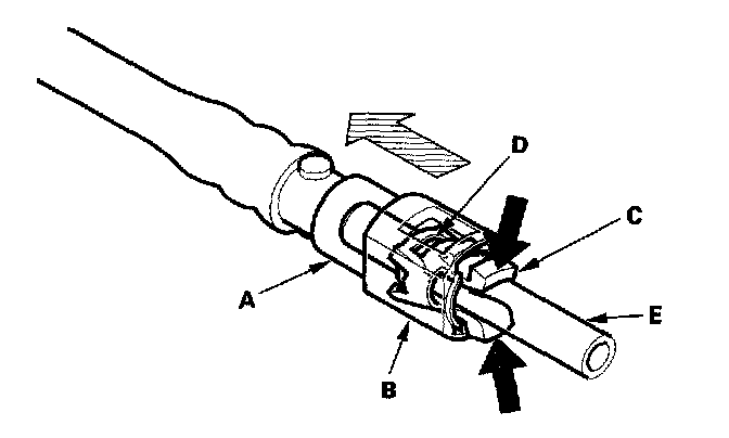 9. Disconnect the quick-connect fitting (A): Hold the connector (B) with one hand, and squeeze the retainer tabs (C) with the other hand to release them from the locking tabs (D). Pull the connector off.