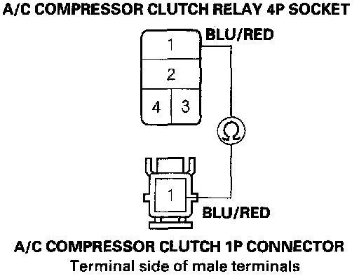 16. Check for continuity between the No.1 terminal of the A/C compressor clutch relay 4P socket and the No.1 terminal of the A/C compressor clutch 1P connector.