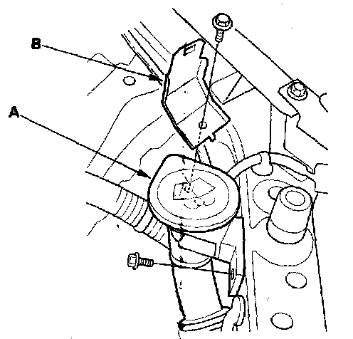 1. Left headlight: Remove the battery, the washer tank neck (A) and the under-hood fuse/relay box bracket (B).