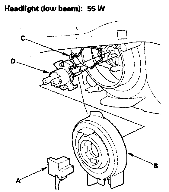 4. Pull the retaining spring (C) away from the bulb (D), then remove the bulb.