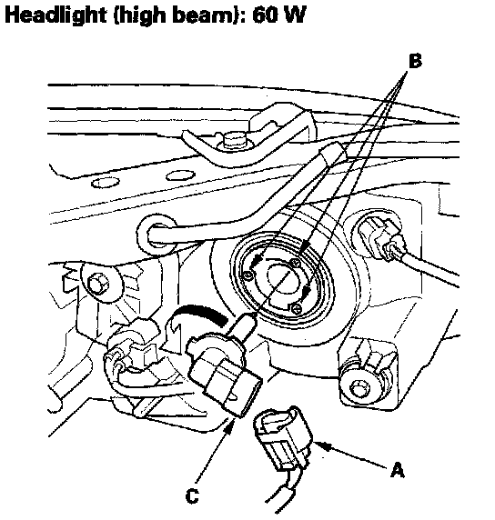 2. Loosen the three mounting screws (B), then turn the bulb socket (C) 45 degrees counterclockwise to remove it from the headlight housing.