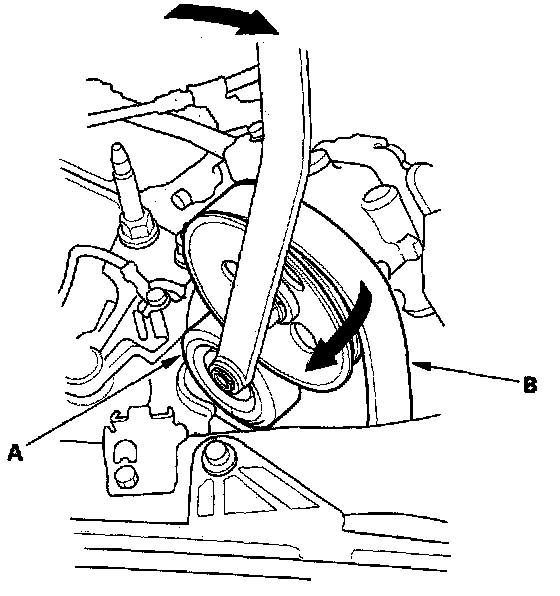 2. Move the auto-tensioner (A) with the belt tension release tool to relieve tension from-the drive belt (B), and remove the drive belt.
