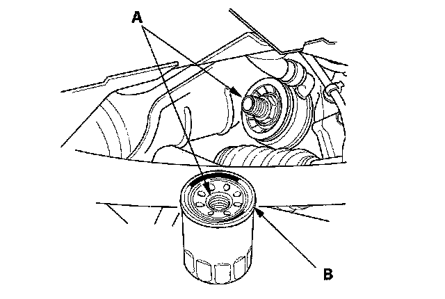 2. Inspect the threads (A) and rubber seal (B) on the new filter. Wipe off the seat on the engine block, then apply a light coat of engine oil to the filter rubber seal. Use only filters with a built-in bypass system.