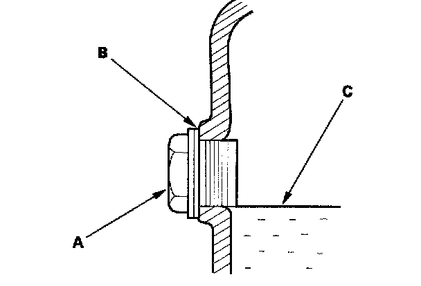 2. Remove the oil filler plug (A) and filler plug washer (B), check the condition of the fluid, and make sure it is at the proper level (C).