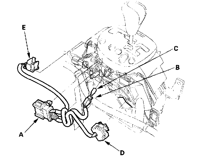 4. Remove the transmission gear selection switch (D) and park pin switch (E), and install the new switches and connector.