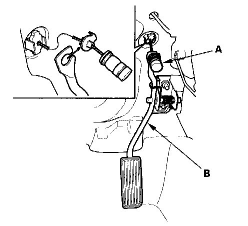 4. Remove the throttle cable (A) from the accelerator pedal (B).