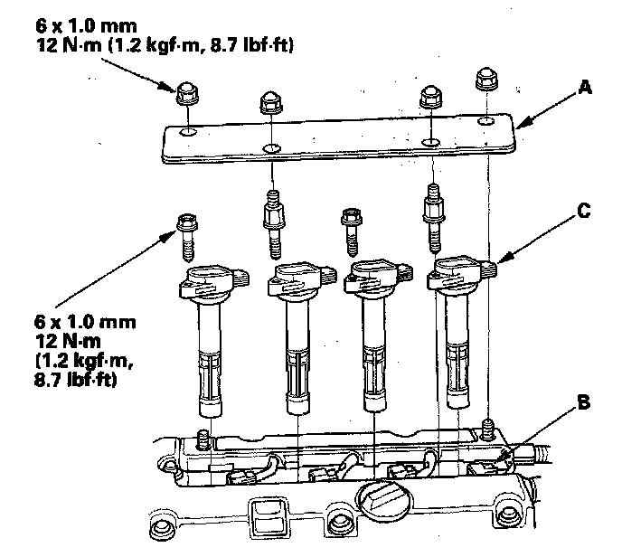 Ignition Coil Removal/Installation1. Remove the ignition coil cover (A), disconnect the ignition coil connectors (B), then remove the ignition coils (C).