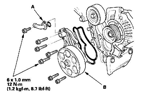 K20A2, K20Z1 engines: Remove the oil cooler joint pipe (A), then remove the seven bolts securing the water pump. Remove the water pump (B).