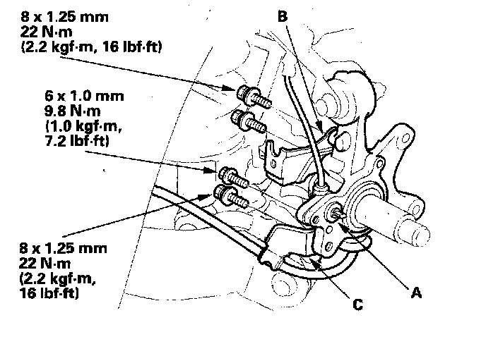 5. Remove the wheel sensor (A), brake hose mounting bracket (B), and parking cable mounting bracket (C) from the knuckle. Do not disconnect the wheel sensor connector.