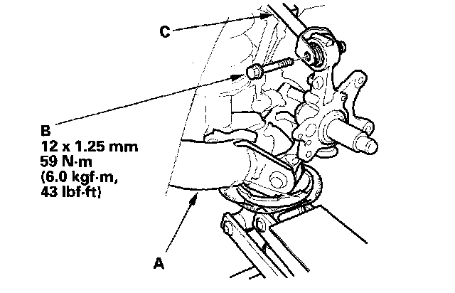 7. Remove the flange bolt (B), then disconnect the upper arm (C) from the knuckle.