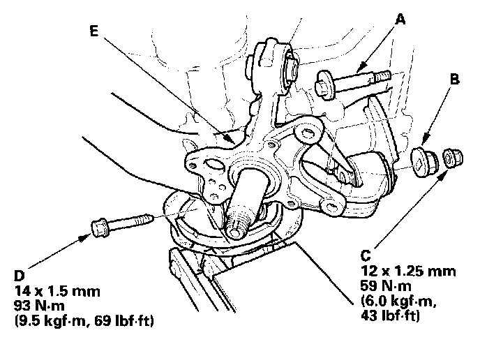 9. Remove the flange bolt (D), and remove the knuckle (E).