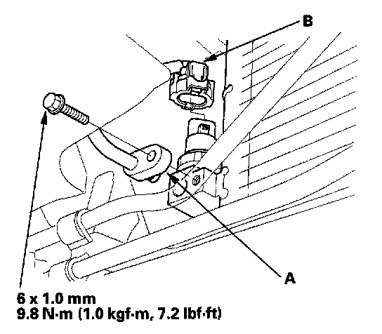 7. Remove the bolt, then disconnect the receiver line (A) from the A/C condenser. Disconnect the A/C pressure switch connector (B).