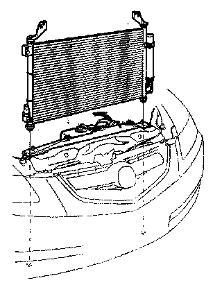 10. Remove the A/C condenser by lifting it up. Be careful not to damage the radiator and A/C condenser fins when removing the A/C condenser.