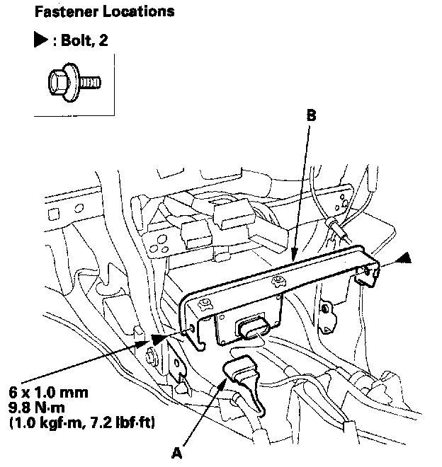 7. Disconnect the connector (A), and remove the bolts, then remove the bracket (B).