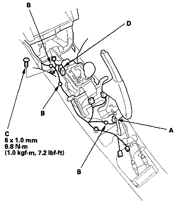 12. From under the dash, disconnect the passenger's door wire harness connectors (A), the three floor wire harness connectors (B) (with navigation system) or the one floor wire harness connector (without navigation system), stereo amplifier connectors (C), and ETC unit connector (D).