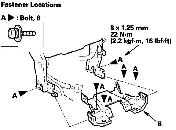 16. Remove the bolts (A), then remove the center bracket (B).