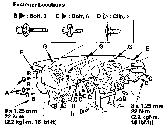 17. From outside the driver's door, remove the caps (A), then remove the bolts (B, C), and clips (D) and lift up on the dashboard (E) to release it from the guide pins (F, G).