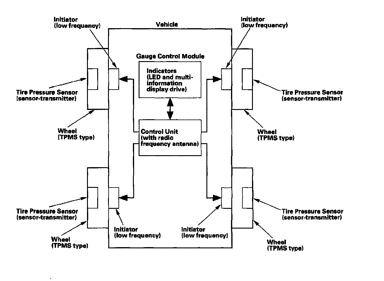 Whenever the engine is running, the TPMS control unit continuously monitors all four tires and the system. If it detects low pressure in a tire, it alerts the driver by turning on the low pressure indicator and the appropriate tire indicator. If it detects a problem in the System, it turns on the TPMS indicator.